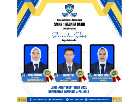 Selamat Datang di Website SMK Negeri 1 Negara Batin. Puji syukur kami panjatkan ke hadapan Allah SWT Tuhan Yang Maha Esa, karena atas limpahan bimbingan-Nya SMK Negeri 1 Negara Batin dapat hadir di tengah masyarakat yang homogen. Sekalipun saat ini website kami masih pada taraf penyempurnaan, namun hal itu dikarenakan kami semua masih dalam taraf belajar untuk masuk dalam dunia teknologi informatika ( TI ).